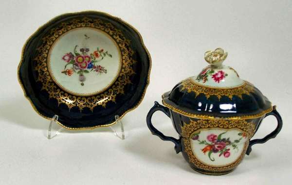 with matched cover, decorated with gilt scroll decoration on a dark blue ground, the circular panels painted with summer flowers, underglaze blue fret mark