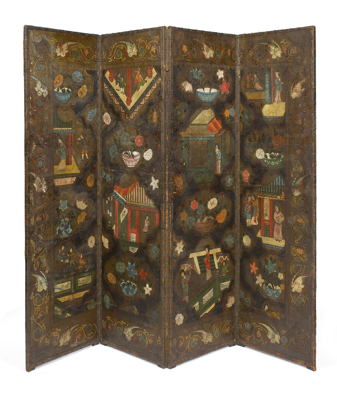 A 19th century Indian floral painted tan leather four fold screen