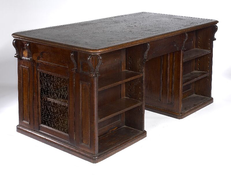 the rectangular top with inset skiver and moulded edge above opposing frieze drawers and panelled pedestals each with two bays of open shelves headed by leaf carved corbels, each end with frieze drawers above wire mesh panelled doors enclosing shelves, on moulded plinth bases, the drawers with Gothic style sunken field trefoil mouldings