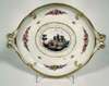 of oval form with twin scroll handles, decorated to the well with flower garlands and sprigs, and painted with an oval panel depicting figures in a landscape scene with a river and building behind, underglaze blue cross sword mark