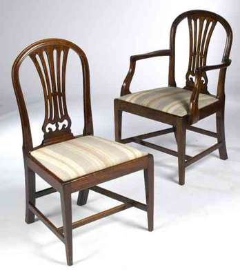 with pierced wheatsheaf splats above drop in seats on square tapering legs united by stretchers, the pair of carvers of a later date (12)