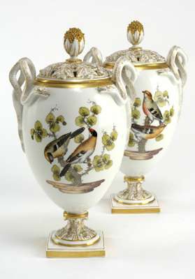 each with an acorn finial above pierced fern leaf cover, the body with serpent handles and painted with songbirds, blue painted cross sword mark (2)