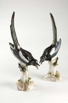 each with long tail extending upwards, perched on a naturalistically modelled tree trunk, blue painted cross sword mark (2)