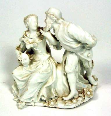 depicting Naples Italian comedy, with a seated lady holding a mask, and a bearded man leaning over her, on a flower encrusted base