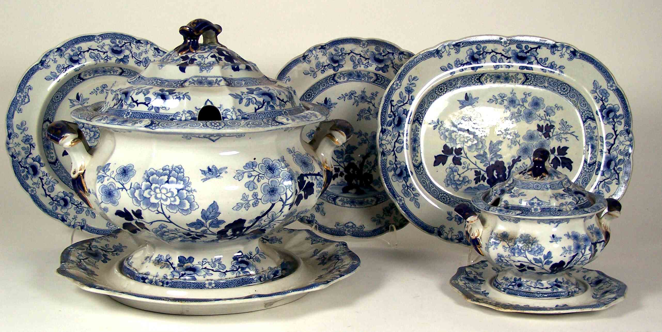 decorated with flowers between diaper borders, comprising: two soup tureens and stands, one with cover; five shaped circular vegetable tureens and three covers; two shaped rectangular vegetable tureens and covers; two sauce tureens, covers and four stands; a fruit comport; a gravy boat and three stands; four leaf shaped dishes; two sauce ladles; a venison dish; eleven graduated ashets; twenty-five soup bowls; thirty meat plates; three fish plates; seven side plates; ten dessert bowls (qty)