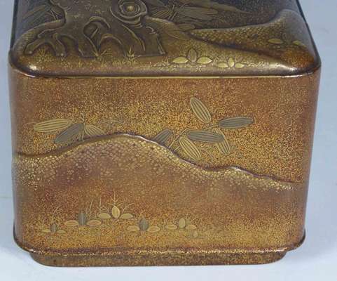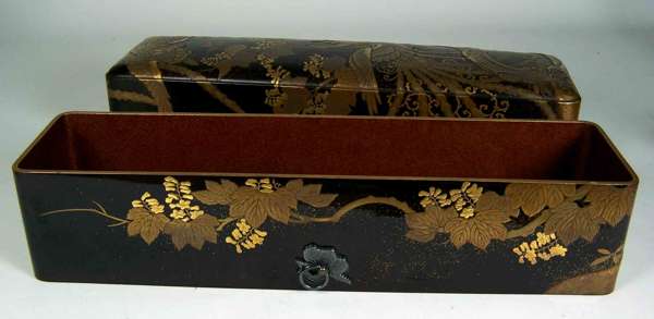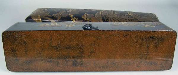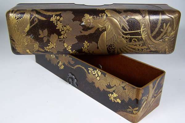 of rectangular form, with white metal foliate handles, decorated to the top and sides with a pair of phoenix, blossom and foliage