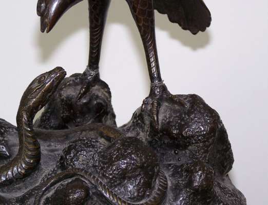 the cover with an eagle standing over a serpent, the globular body decorated with a birds and stylised flowers and foliage, on a pierced scroll base