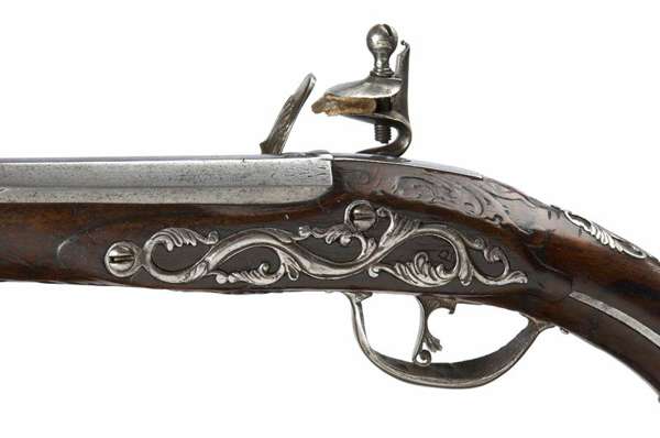 the rounded banana shaped lock with finely chiselled acanthus leaf at the tail and on the frizzen back, rubbed signature Anton Boniscolo, elegant shaped cock with floral chiselled cock retaining screw head, trigger cut and scrolled with foliate chiselling, replacement trigger guard, bulbous spurred pommel with chiselled acanthus leaves on both sides and floral butt cap en suite with cock retaining screw, pierced and cut steel blank escutcheon, finely cut foliate side plate, the two stage barrel octagonal at the breech tapering to a slender muzzle with rubbed classical portrait head at the breech, plain tang, dark walnut full stock carved with foliate scrolls at the barrel tang, trigger guard finial and rear chiselled steel ramrod pipes, replacement ramrod
