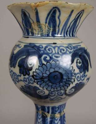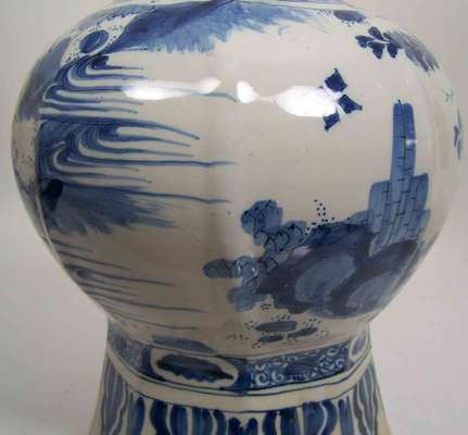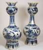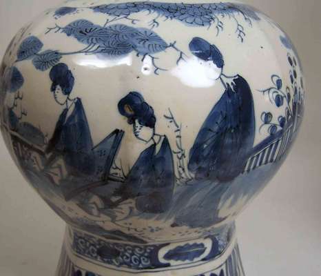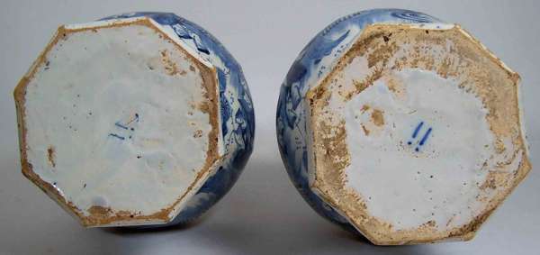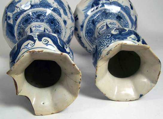 each with flared scalloped rim above garlic bulb neck, flaring faceted sides and faceted globular body with spreading octagonal foot, decorated to the neck and foot with bold flowerheads and stylised foliage and to the body with a continuous frieze of Chinese figures in a garden landscape (damages) (2)