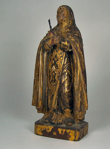 the figure wearing a habit and gazing upwards, her crossed arms holding a gilt metal frond, her robes decorated with gilt C-scrolls on a black ground, on plinth base with canted corners