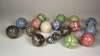 in striped and foliate patterns, coloured in green, blue, black and pink, comprising 16 bowls and two small jacks (18)