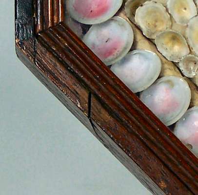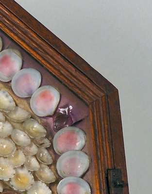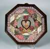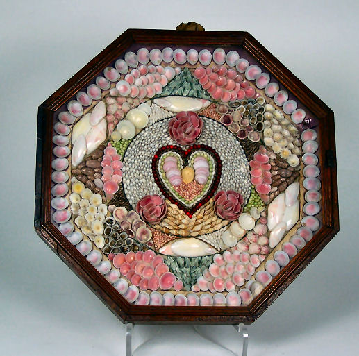 the central heart and triple rose shellwork motif within a geometric stylised foliate border, framed