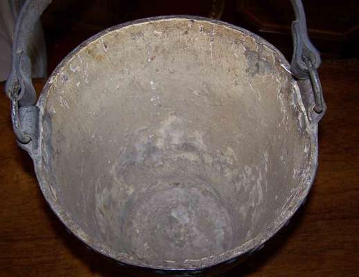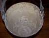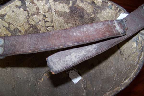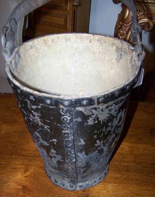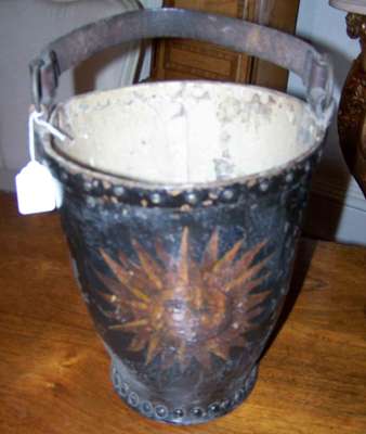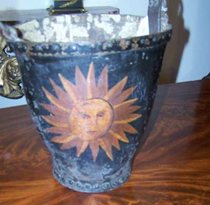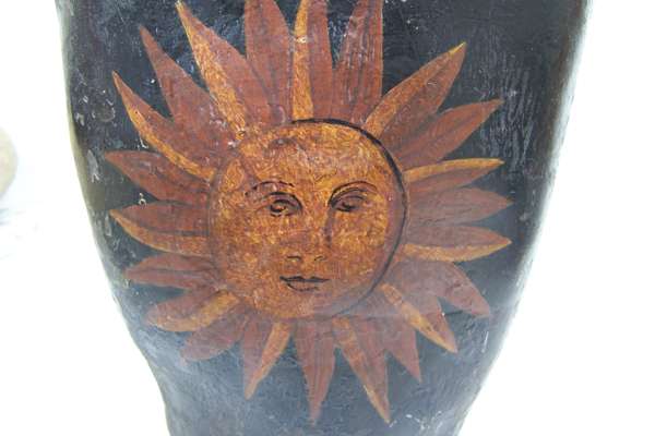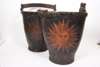 with leather strap handles, the studded tapered cylindrical sides painted with a sun motif (2)