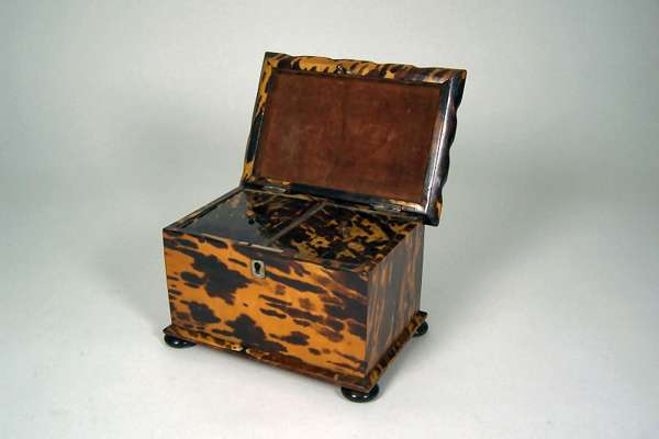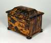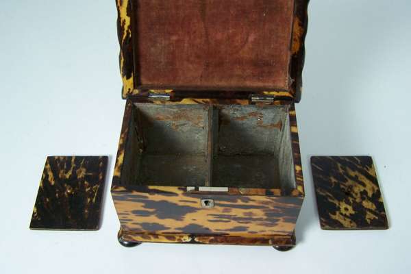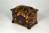 the ogee moulded hinged lid opening to reveal a covered compartmented interior, raised on squat bun feet
