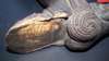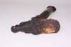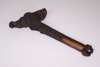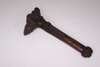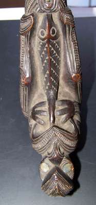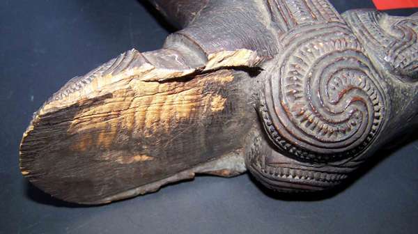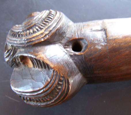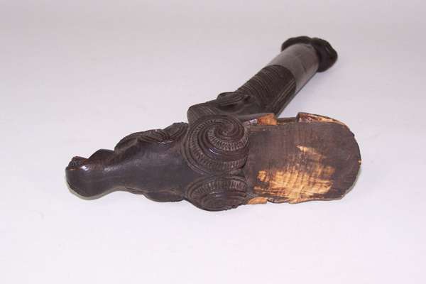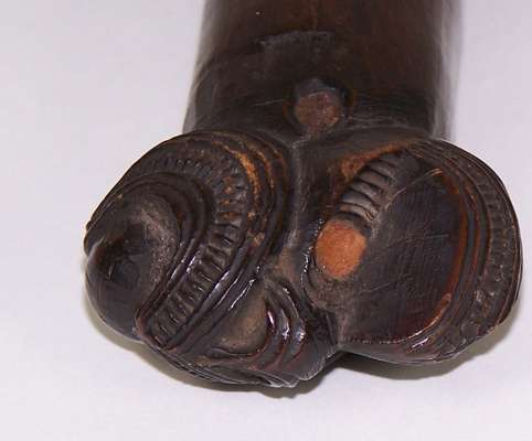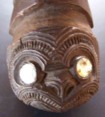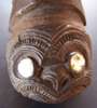 the head carved with a seated grotesque mask bird with paua shell eyes above a spirally hatched shaft with bird mask terminal, drilled for a loop handle