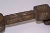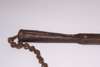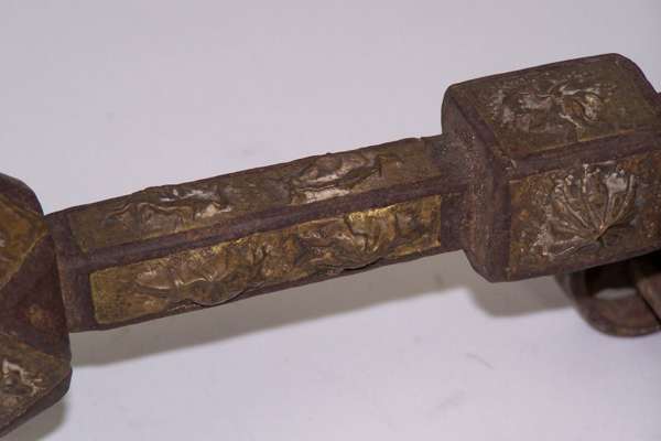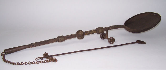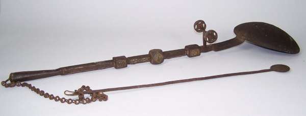 the large shallow bowl on a knopped and foliate cast square section stem with trestle castors and long-handled mote spoon secured to the turned handle by a chain