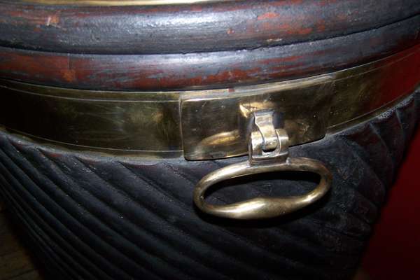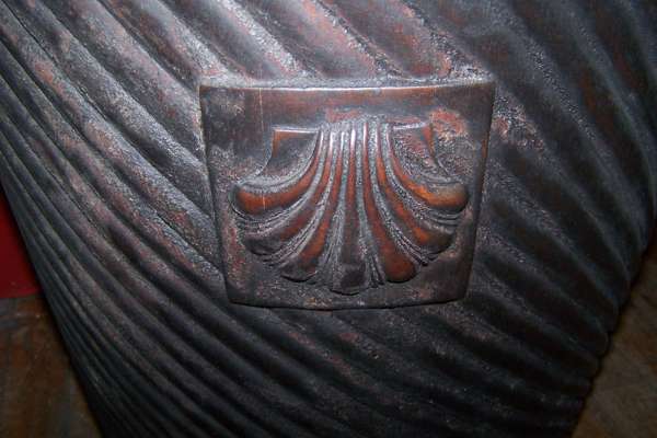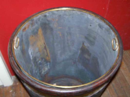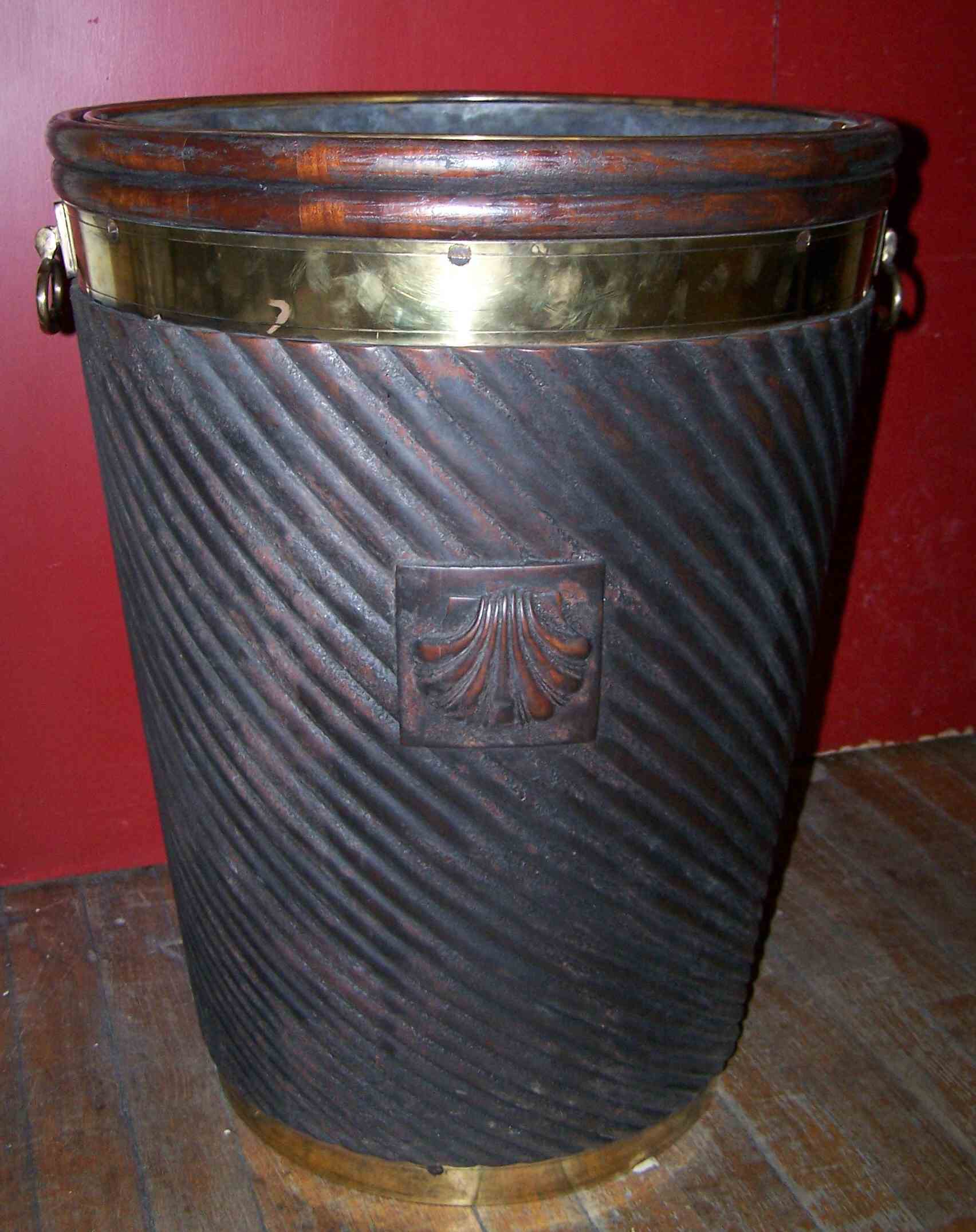 of tapering spirally reeded form, decorated with scallop shell panels, flanked by brass drop handles, with brass liner