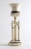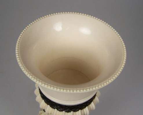 the flared part gadrooned bowl with a beaded rim and a tortoise shell band, on an elaborately turned and carved triform stem, raised on a fluted base