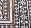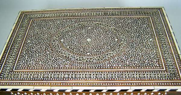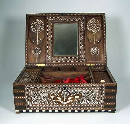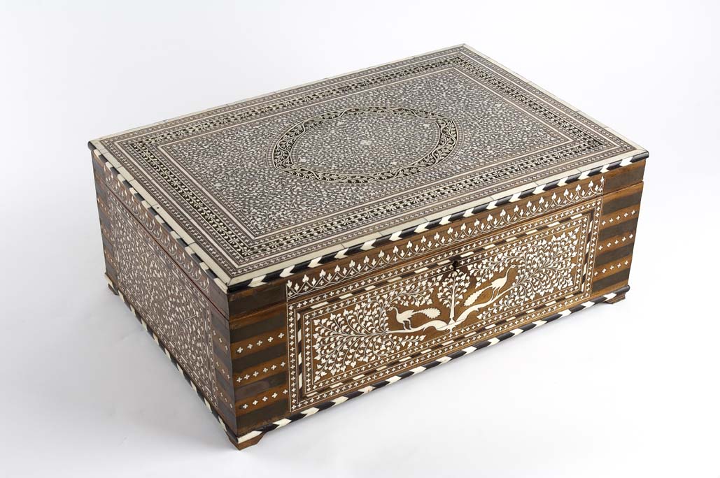 with chevron banding and inlaid throughout with scrolling foliage and stylised motifs, centred by a shaped reserve depicting two peacocks standing beneath a tree, the hinged lid opening to reveal a compartmented interior with covered wells, a removable tray and mirrored plate