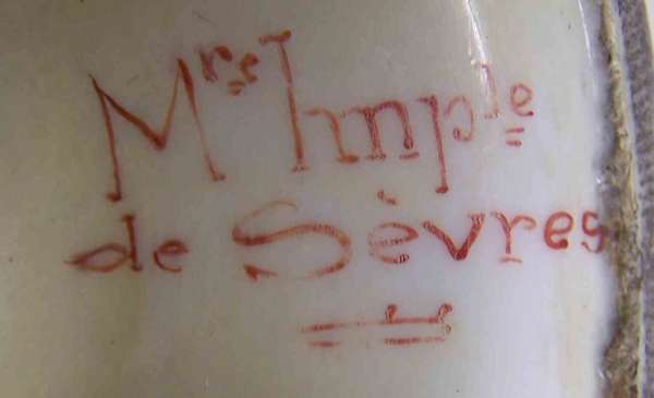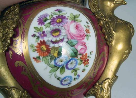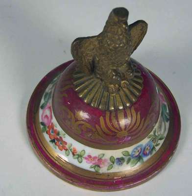 The domed lids with eagle finials, the ovoid sides painted with panels of flowers against a gilt enhanced puce ground, raised on three eagle mask supports and triform bases, painted red marks 'Mre Imple de Sevres' (2)