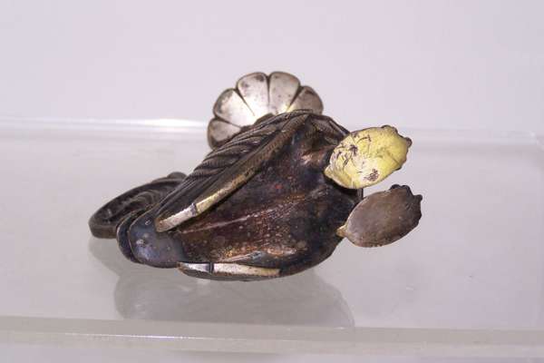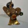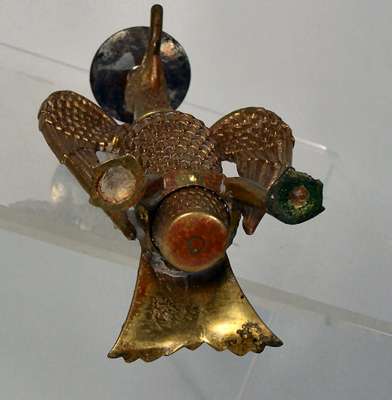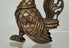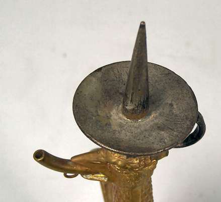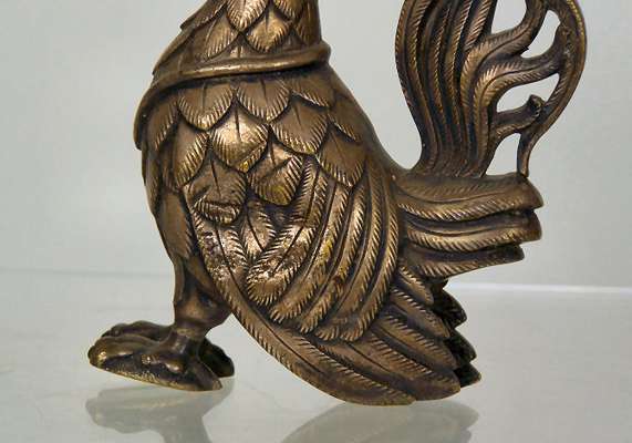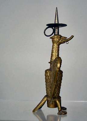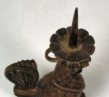 one cast in giltmetal in the form of an eagle with outstretched wings and naturalistic feathers, holding a tubular burner in its beak and surmounted by a silvered spike with ring handle, on talon feet, 11cm wide, 25.5cm high, 8cm deep; the companion in the form of a silvered bronze cockerel, with ornate tail feathers and spike with cusped wax pan, on talon feet, 5cm wide, 20cm high, 11cm deep (2)