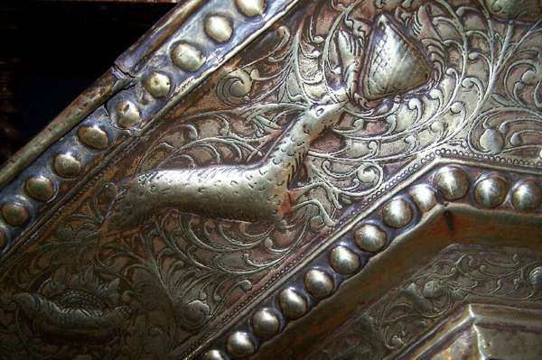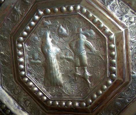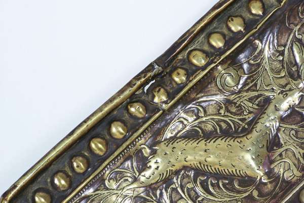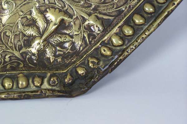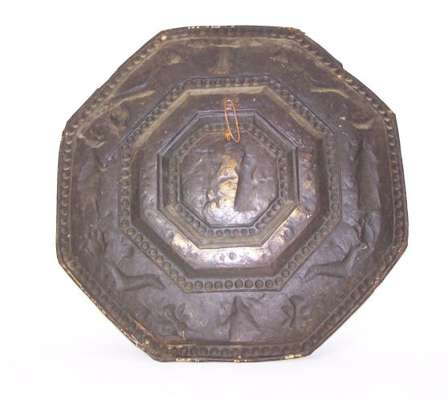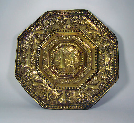 of octagonal form, embossed with figures, wild animals and scrolling foliage within bead moulded borders, centred by a shaped reserve depicting a portrait of William and Mary