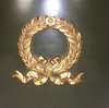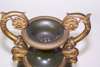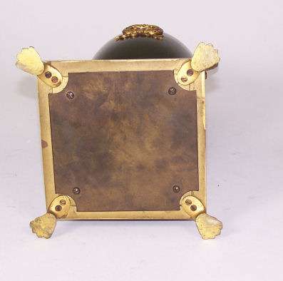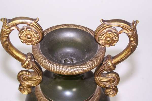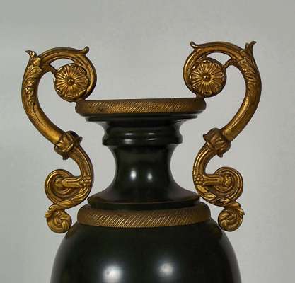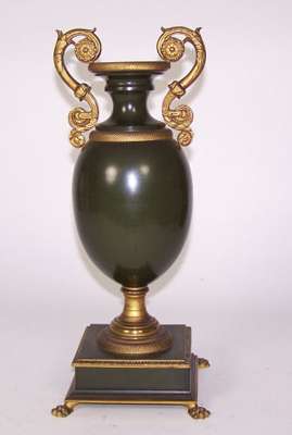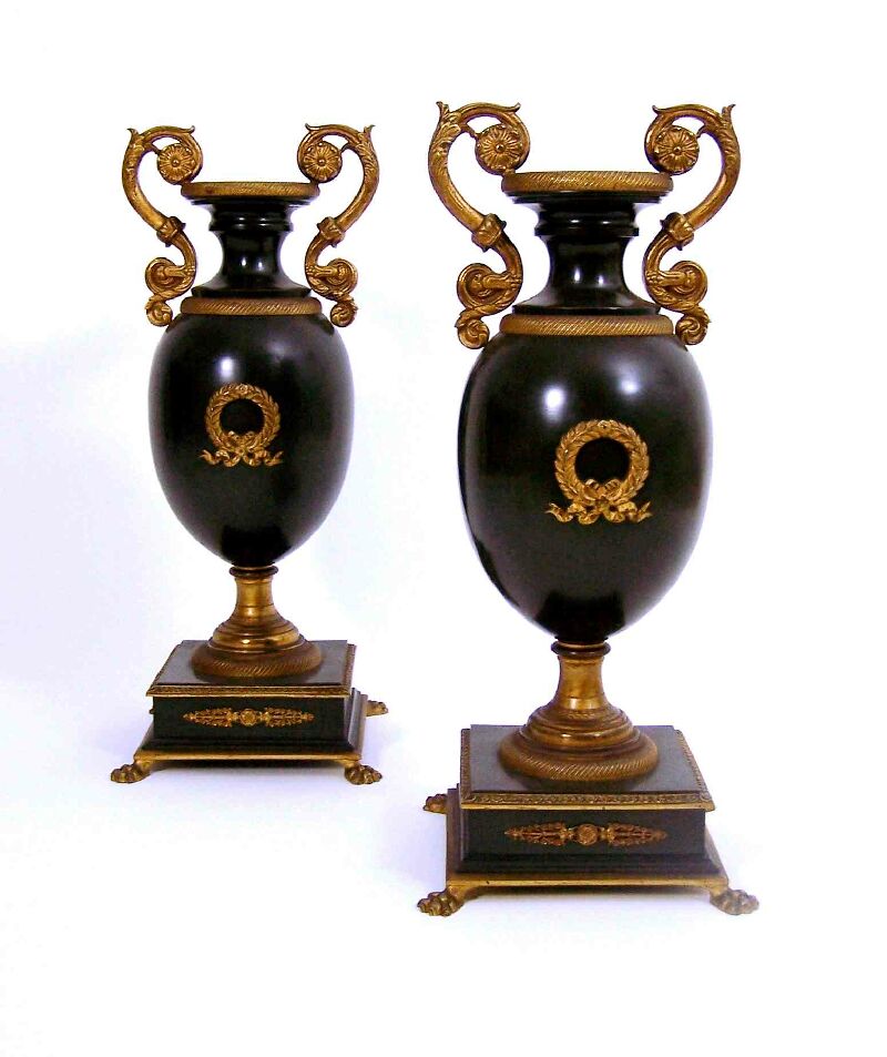 the flared necks with twin scroll handles, the ovoid sides with applied laurel wreath mounts, raised on a socle foot and square bases, terminating in paw feet