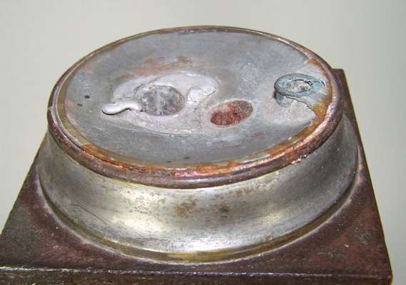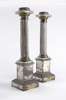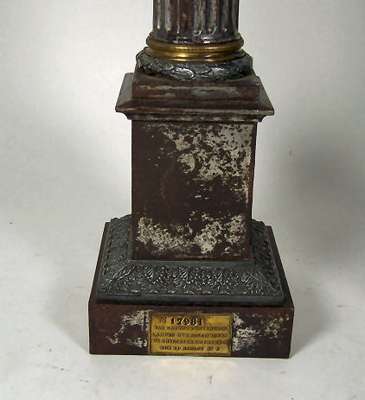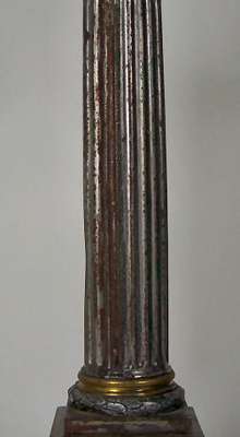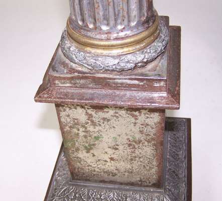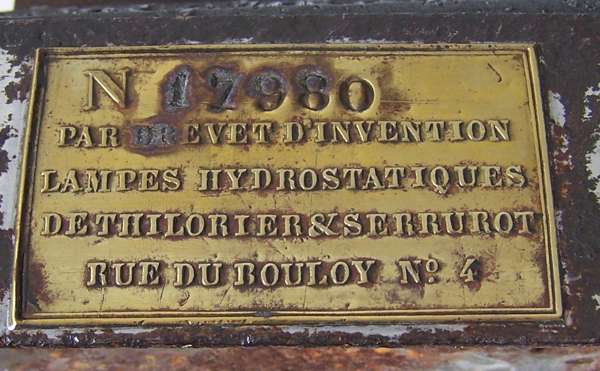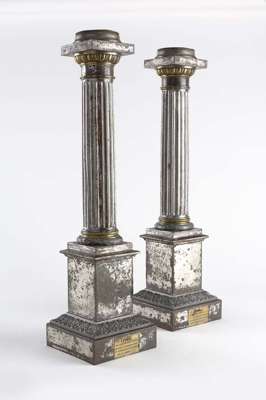 the fluted columnar stems raised on stepped square pedestal bases, each bears brass plaque 'PAR BREVET D'INVENTION / LAMPES HYDROSTATIQUES / DE THILORIER & SERRUROT / RUE DU BOULOY No. 4' and numbered 17980 & 81 (2)