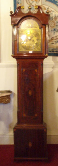 the twin train movement with anchor escapement striking the hours on a bell, the swan neck pediment with eagle finial above an arched brass dial signed Thos. Spence, Dysert (sic.) to the arch, with roman and arabic chapters, the matted centre with subsidiary seconds and calendar dials, between rococo-cast spandrels, the case with fluted quadrant corners above a plinth base, on bracket feet, the whole decorated with flower-filled urns, rosettes and shell paterae