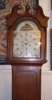 the arched dial painted with flowering urns, a fruiting basket and exotic birds, the eight-day twin train movement with anchor escapement and striking on a bell, the hood with a broken swan neck pediment flanked by turned pilasters, the canted rectangular case raised on bracket feet