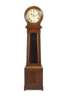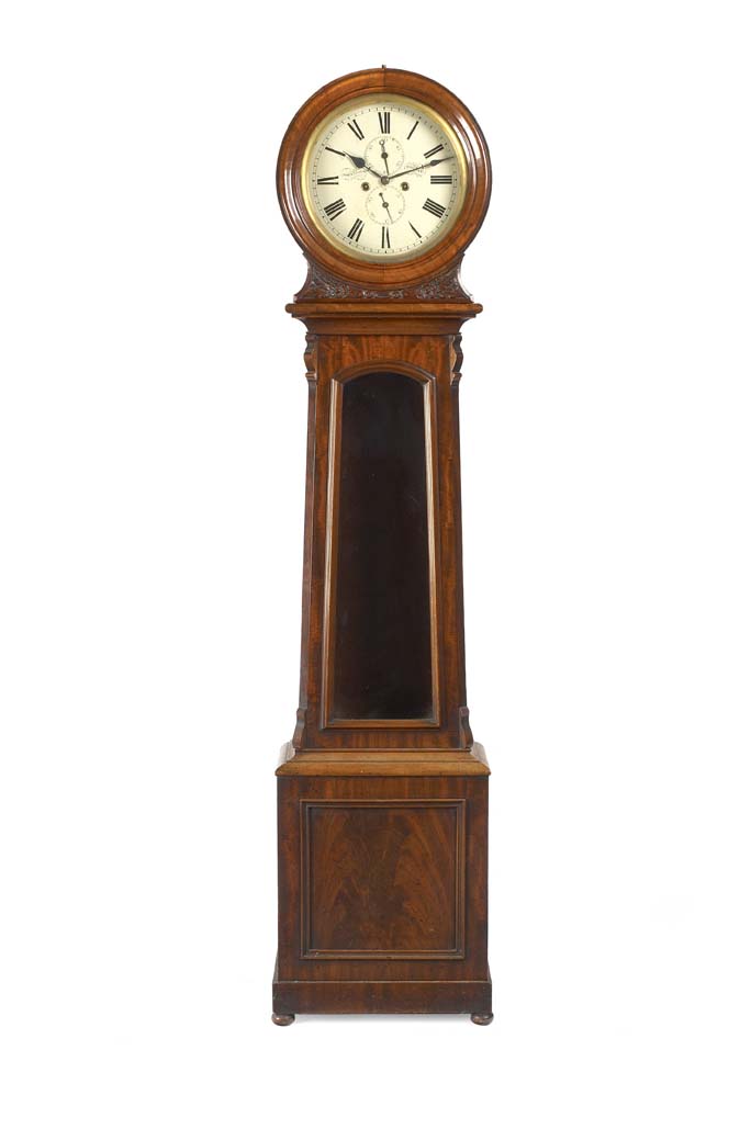 the circular painted dial with subsidiary date and second dials, the movement with dead-beat anchor escapement and maintaining power and striking on a gong, the circular moulded hood with foliate carved decoration above a tapered rectangular case with panelled apron and squat bun feet