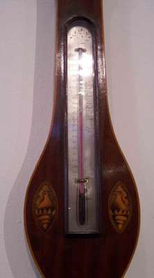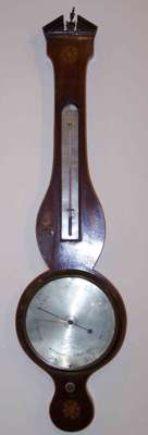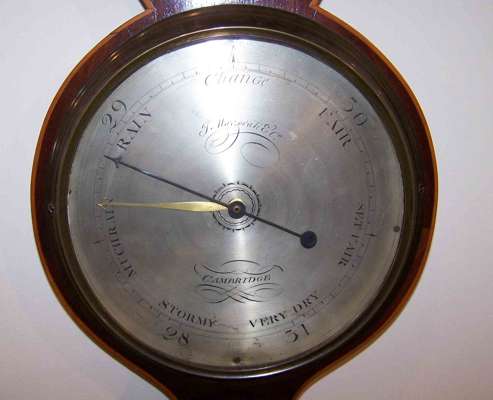 the broken triangular pediment above engraved thermometer and pressure dial, signed F. Mazzorati, Cambridge, with ivory screw, the case decorated with shell paterae