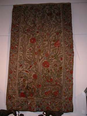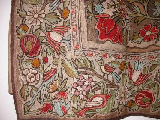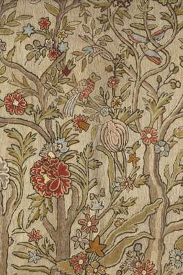 the beige field with floral bird filled tree of life pattern, within floral leafy bird filled vine border