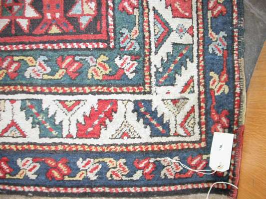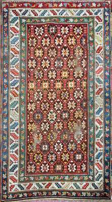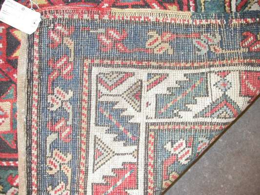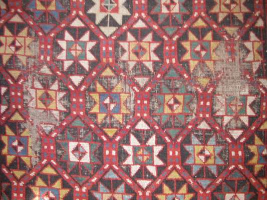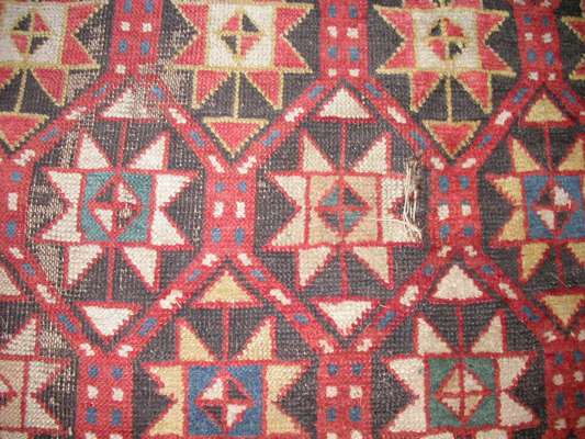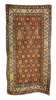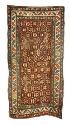 the brown field with allover lattice and star pattern, within ivory serrated leaf and wine glass border between green and indigo scroll bands