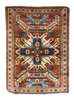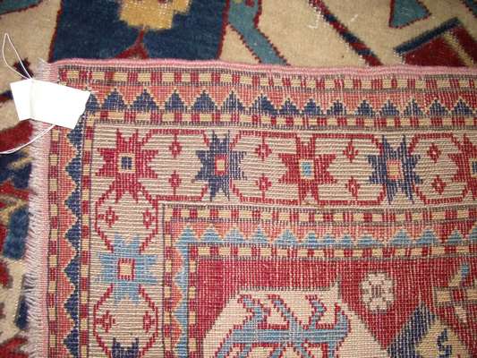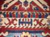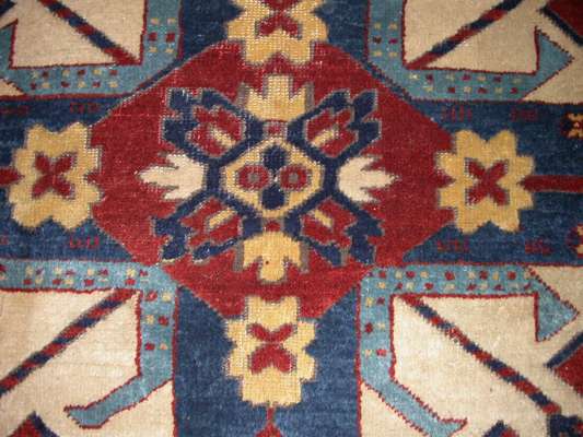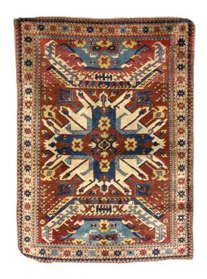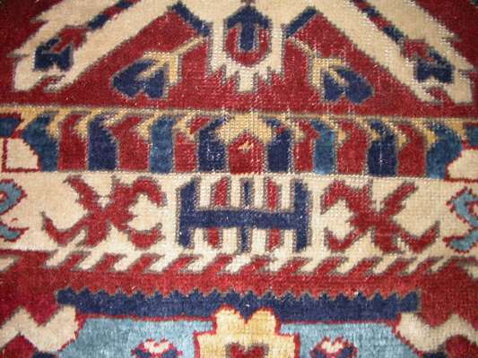 the red field with central cream lozenge and indigo cruciform motif, flanked by hooked wings, within cream star and angular vine border between pyramid bands