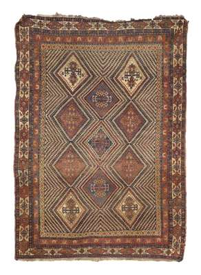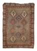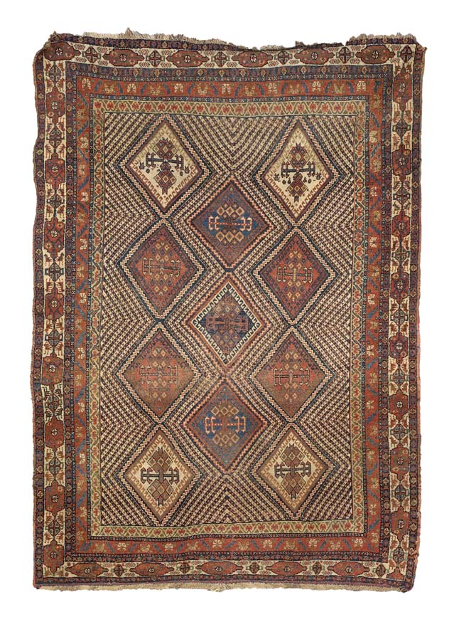 the zig zag field with eleven polychrome lozenge medallions, within cream cartouche border between multiple bands