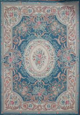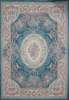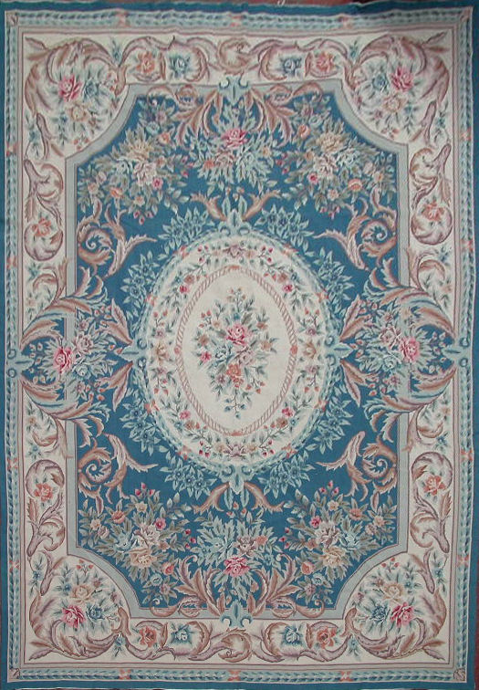 the blue field with central cream oval floral medallion, within cream scrolling acanthus and floral border with outer blue bands