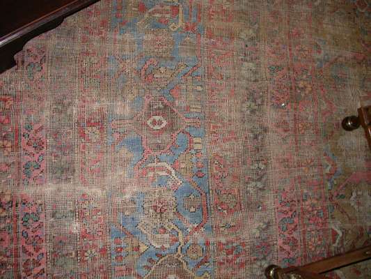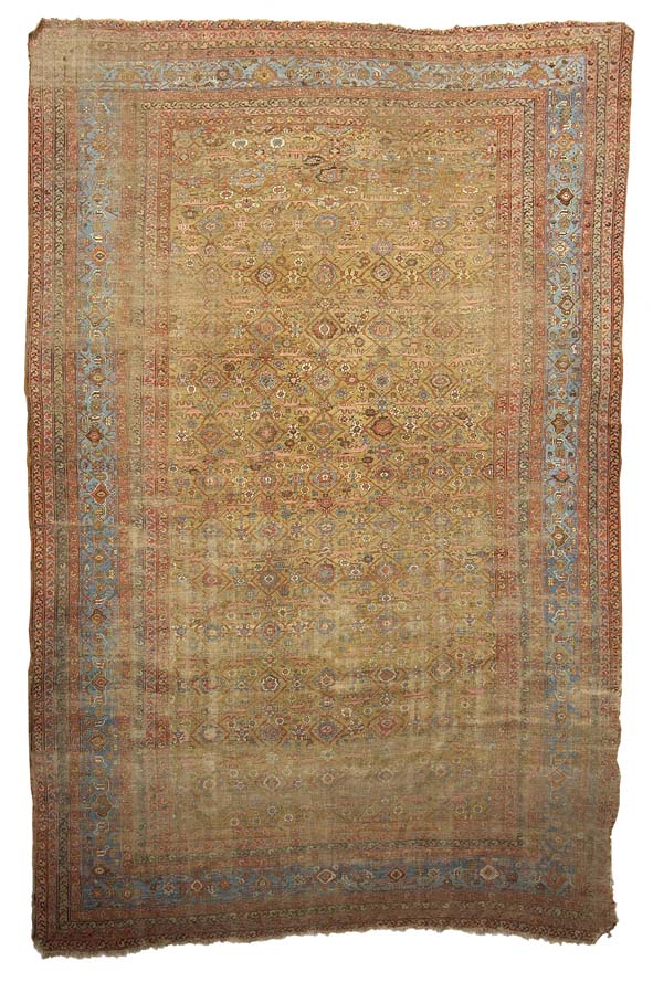 the camel field with allover rosette lozenge and serrated leaf pattern, within blue turtle palmette border between various bands (worn)