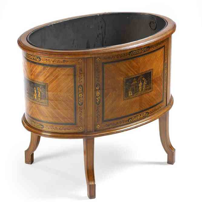 the sides decorated with four chinoiserie lacquer panels depicting figures in garden landscapes within ebonised, line inlaid and floral painted outer borders enclosing a metal liner on four splayed square section legs with inswept feet
