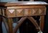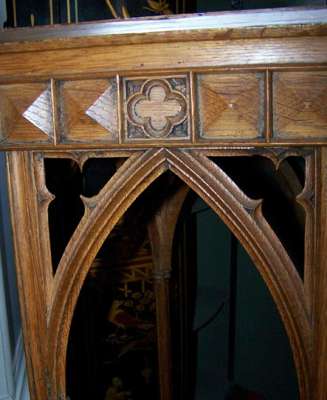 the top with moulded edge and reversible solid (with baize lined verso) panel above a 'hob nail' carved frieze centred by quatrefoils, on six slender moulded uprights headed by lancet arches and trefoil spandrels, the moulded plinth base with a broad frieze of pierced tracery enclosing a metal lined void