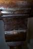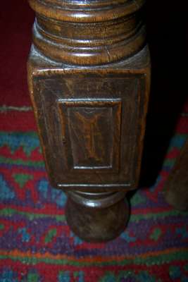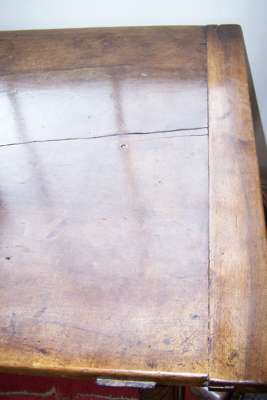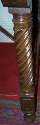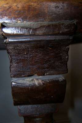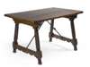 the plank top with cleated end rails above four spirally turned and splayed legs on turned feet united by scalloped and tablet carved stretchers joined by a pair of wrought iron wrythen twist under braces