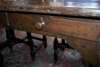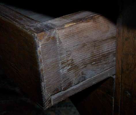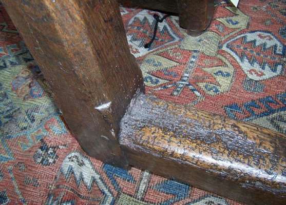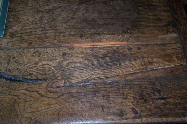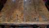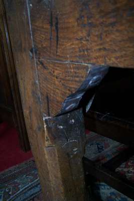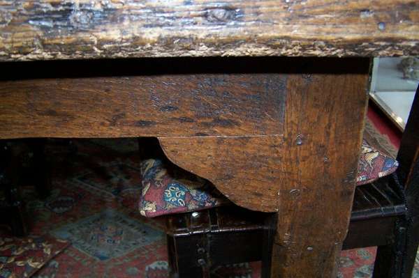the rectangular top composed of four well-figured planks with cleated ends, the frieze with shaped corner frets enclosing a pair of frieze drawers with turned handles, on square section legs with chamfered corners united by stretchers