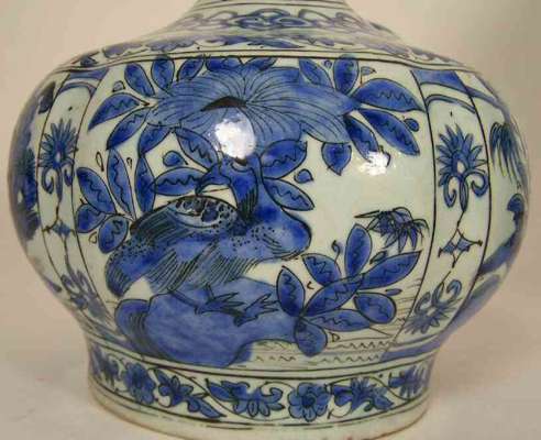 the neck and shoulders decorated with bands of stylised flowers and foliage, the sides with panels of birds and animals within landscapes, black painted mark