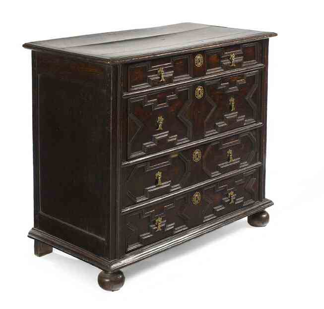 the rectangular top with moulded edge above four long geometrically panelled drawers with bifurcated scroll handles and pierced escutcheons, the sides of plain single panel form, on skirted base and bun feet