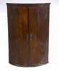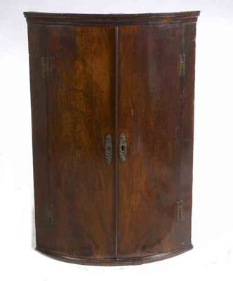 the moulded cornice above a pair of well figured doors enclosing shelves, with brass rococo embossed escutcheons and H-hinges