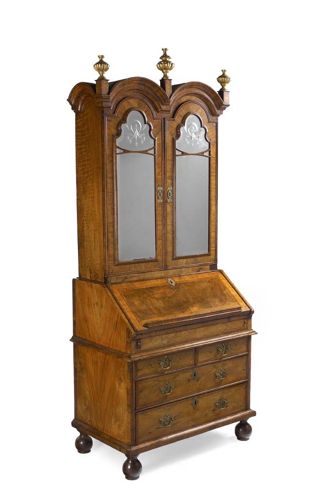 the double arched cornice with gadrooned giltwood urn finials above a pair of re-entrant arched and engraved doors enclosing an arrangement of similarly veneered drawers and pigeon-holes around an ogee panelled interior cupboard and a pair of candle slides, the sloping fall with book-rest enclosing a similarly fitted interior with leathered inset and sliding well above a lipped frieze and two short over two long graduated drawers with foliate pierced brass drop handles, on skirted apron and bulbous turned feet