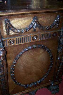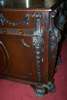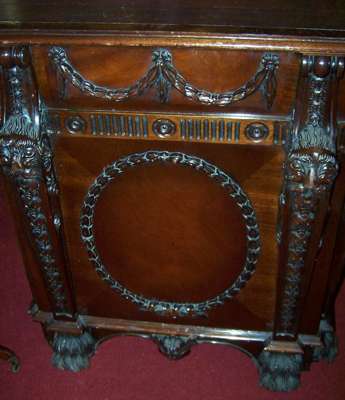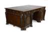 the rectangular top with gilt tooled burgundy skiver above a fluted and swag-carved frieze with a pair of arched central drawers above substantial wreath-carved pedestals, each with twin lion mask and husk carved pilaster uprights and enclosing folio racks, ending in hairy paw feet, the sides similarly carved and decorated (20th century)