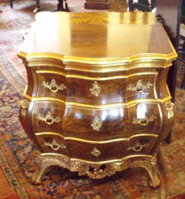 of serpentine bombe form, the three shaped long drawers with rococo cast handles and escutcheons, on rococo pierced and carved apron with scrolling legs