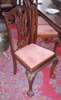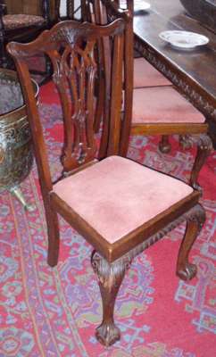 the leaf carved serpentine top rails above Gothic pierced splats and drop in seats with gadrooned rails, on leaf carved cabriole legs with claw and ball feet including two carvers (8)