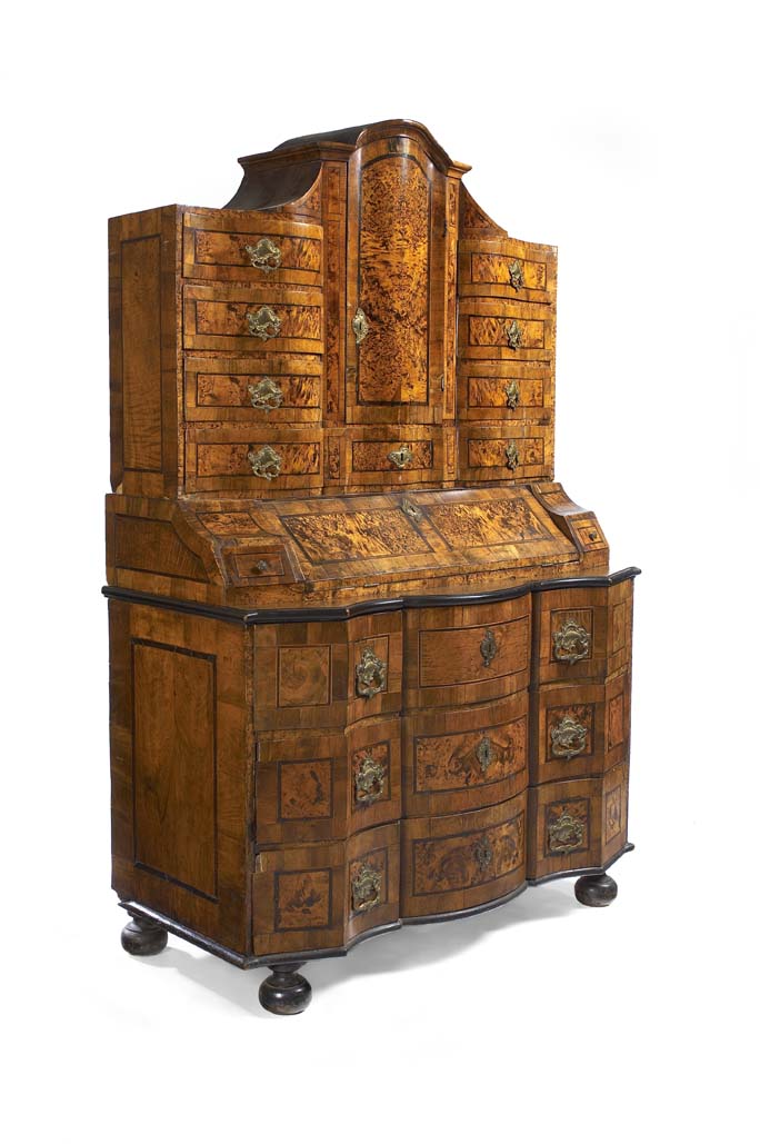 of serpentine outline, the arched top with a central cabinet door enclosing a fitted interior between six short and a long drawer, the shallow central fall enclosing shelved mirror between short drawers, the lower part with three long drawers with Baroque style gilt metal handles, on skirted ebonised apron and boldly turned bun feet
